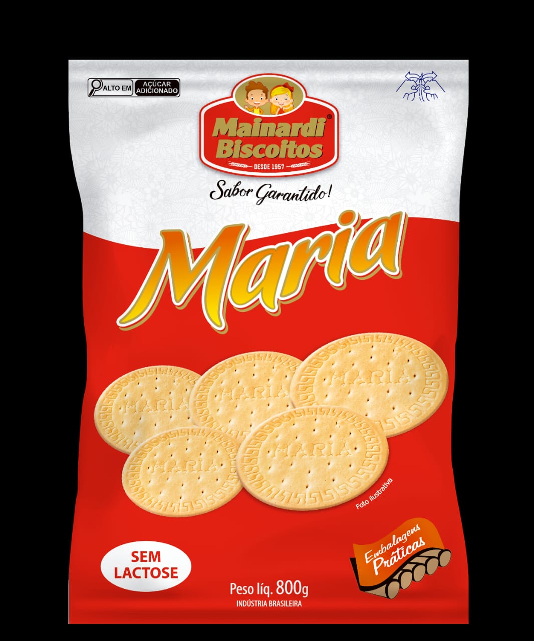 Farinha de trigo enriquecida com ferro e ácido fólico, açúcar, gordura vegetal hidrogenada, amido de milho, sal, fermento químico (bicabornato de sódio, bicabornato de amônia) lecitina de soja e aroma sabor Maria.